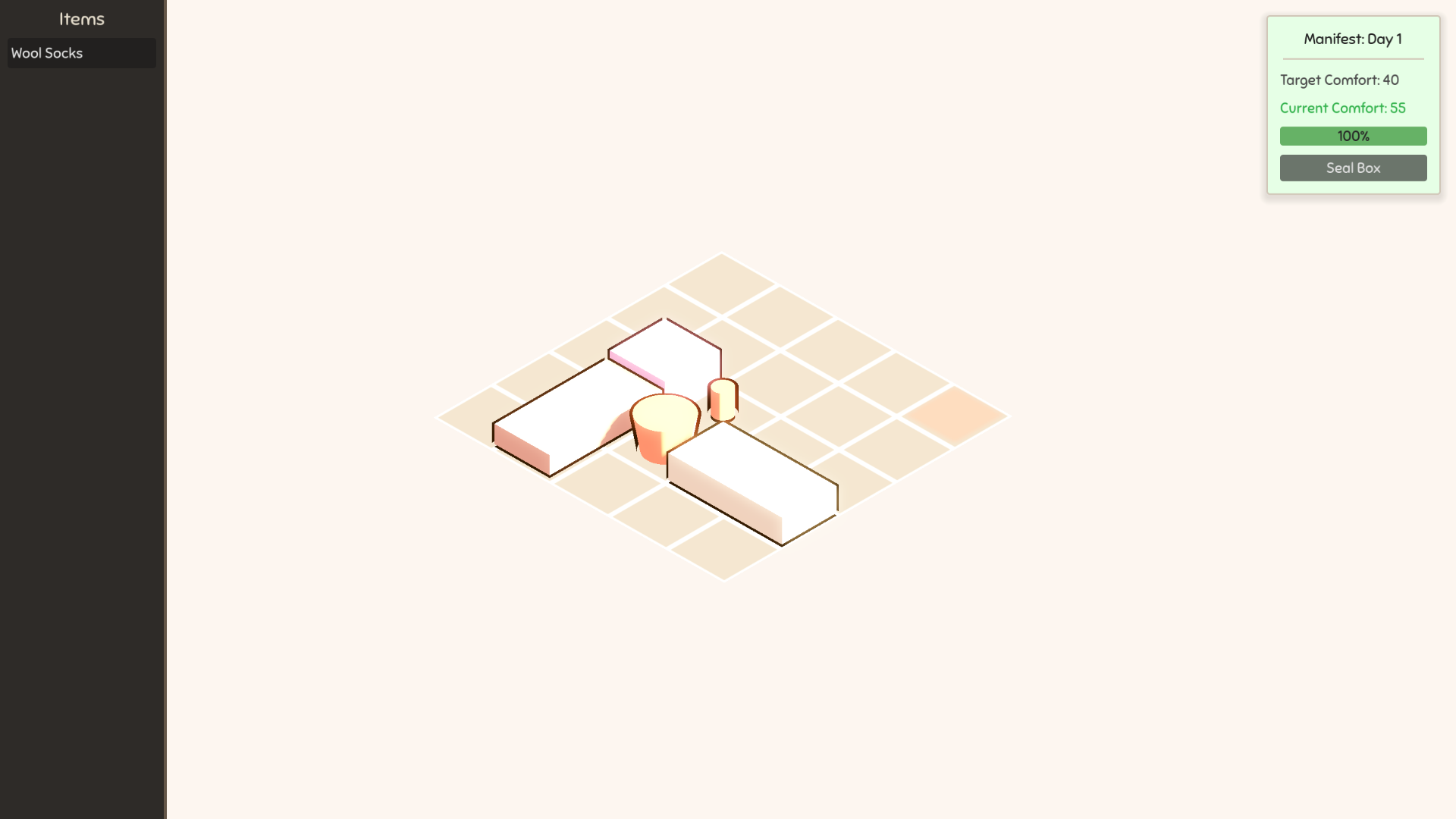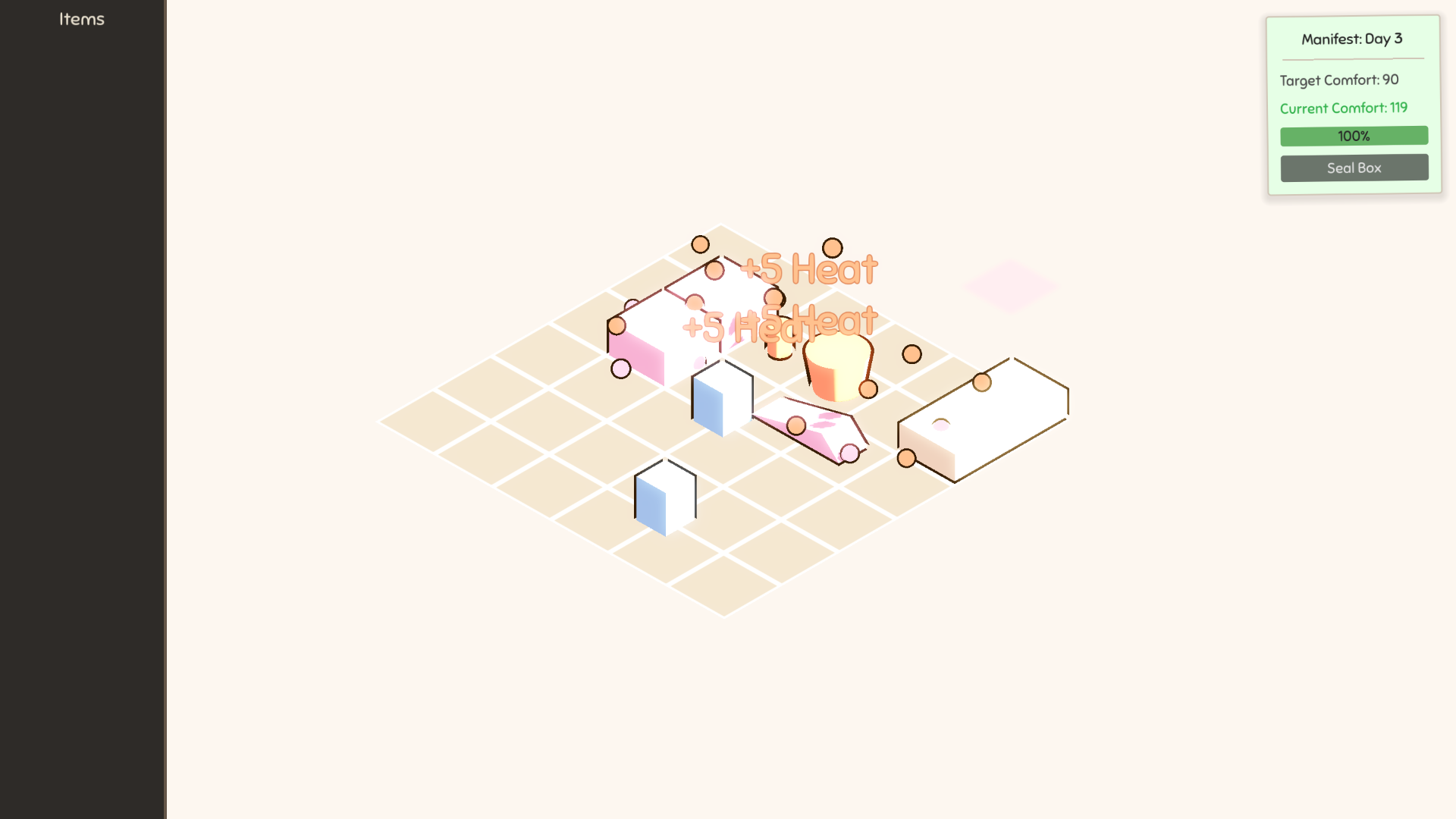 - Fill the Receipt: Reach the Target Comfort score to unlock the "Seal Box" button and proceed to the next day!