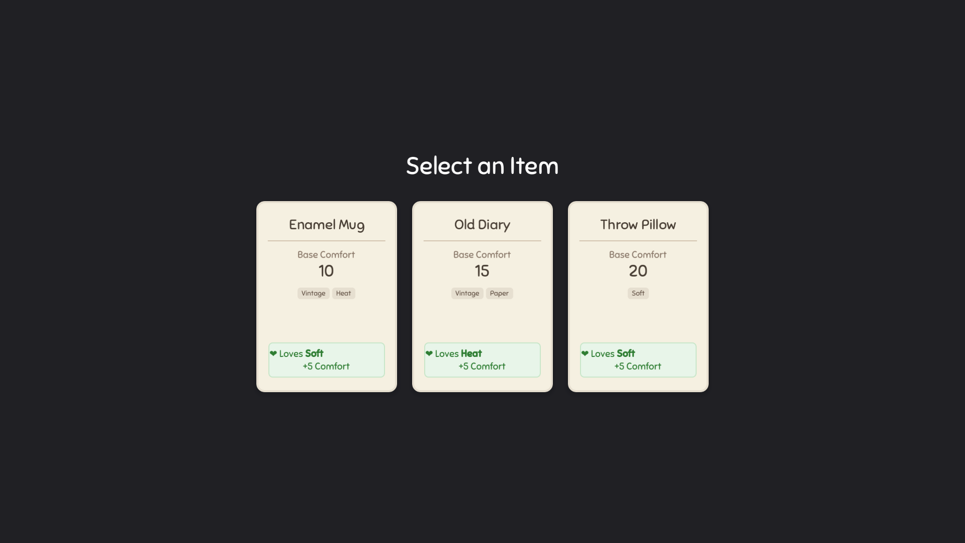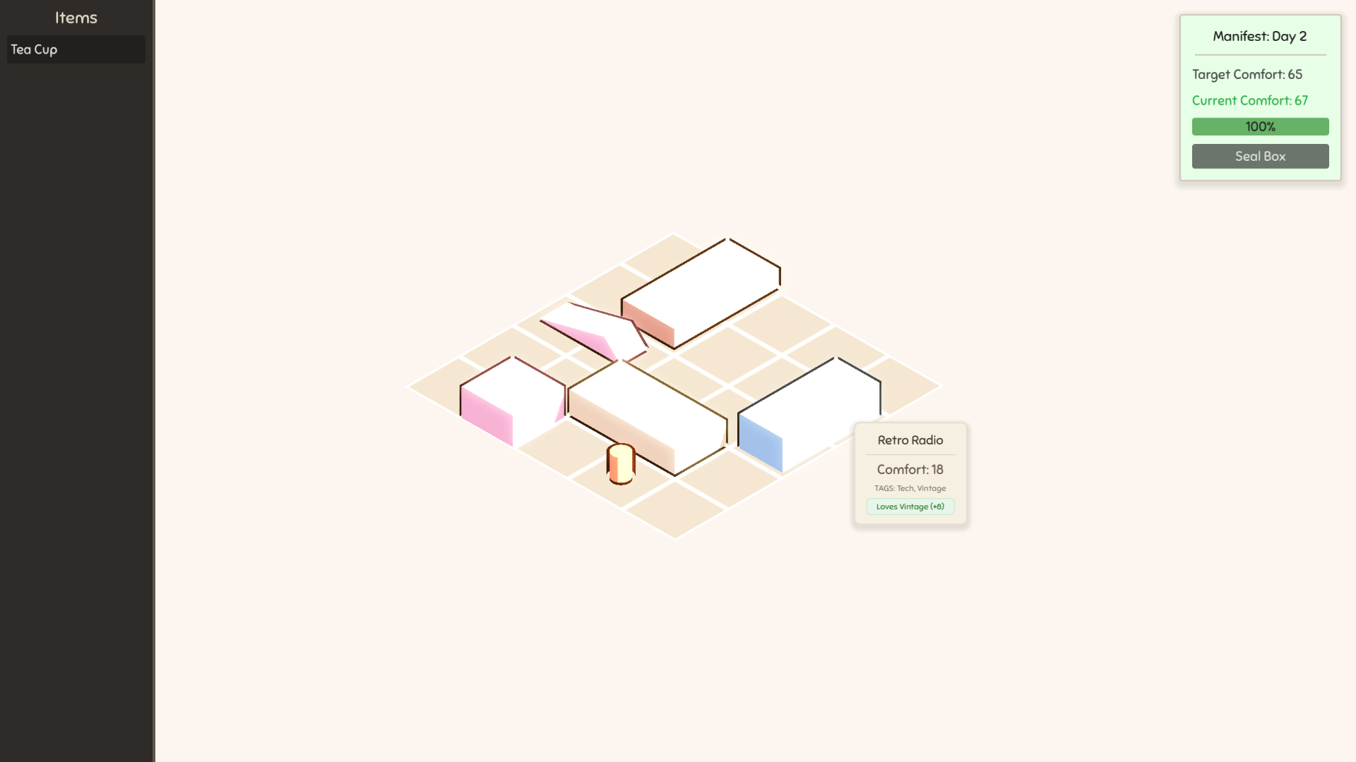 [Heat],[Soft], and[Vintage]. Place a Mug of Tea next to Wool Socks to trigger satisfying synergy combos and watch your Comfort Score soar! Be careful, though—putting a hot Candle next to a Vintage Diary might cost you points. - Spatial Roguelike Deckbuilding: Choose 1 of 3 random items to keep at the end of each day. Build a custom "deck" of physical items tailored to your specific packing strategy.